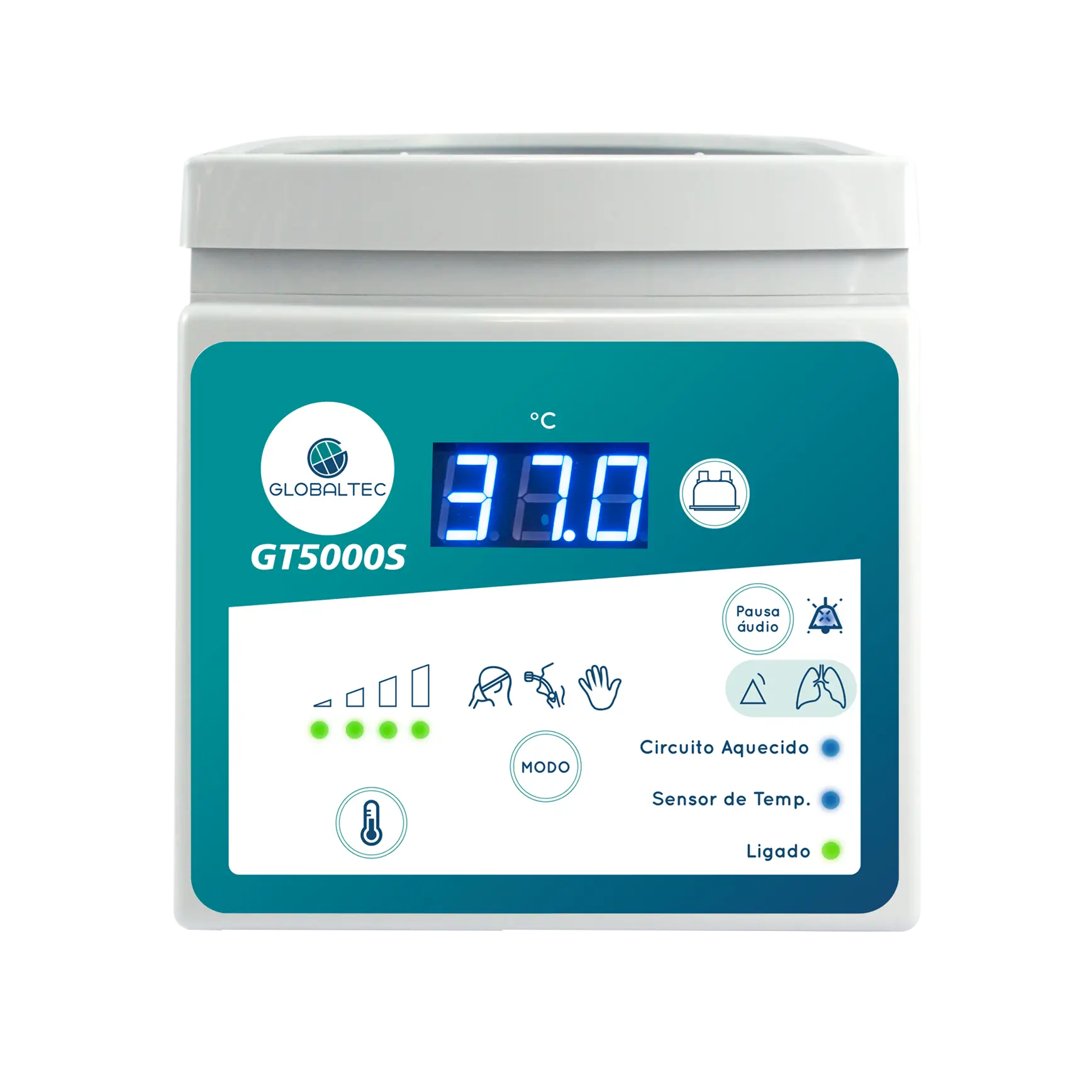 Equipado com display digital de fácil leitura, alarmes audiovisuais e proteção automática contra superaquecimento, o GT5000S assegura estabilidade e segurança térmica durante o suporte ventilatório.